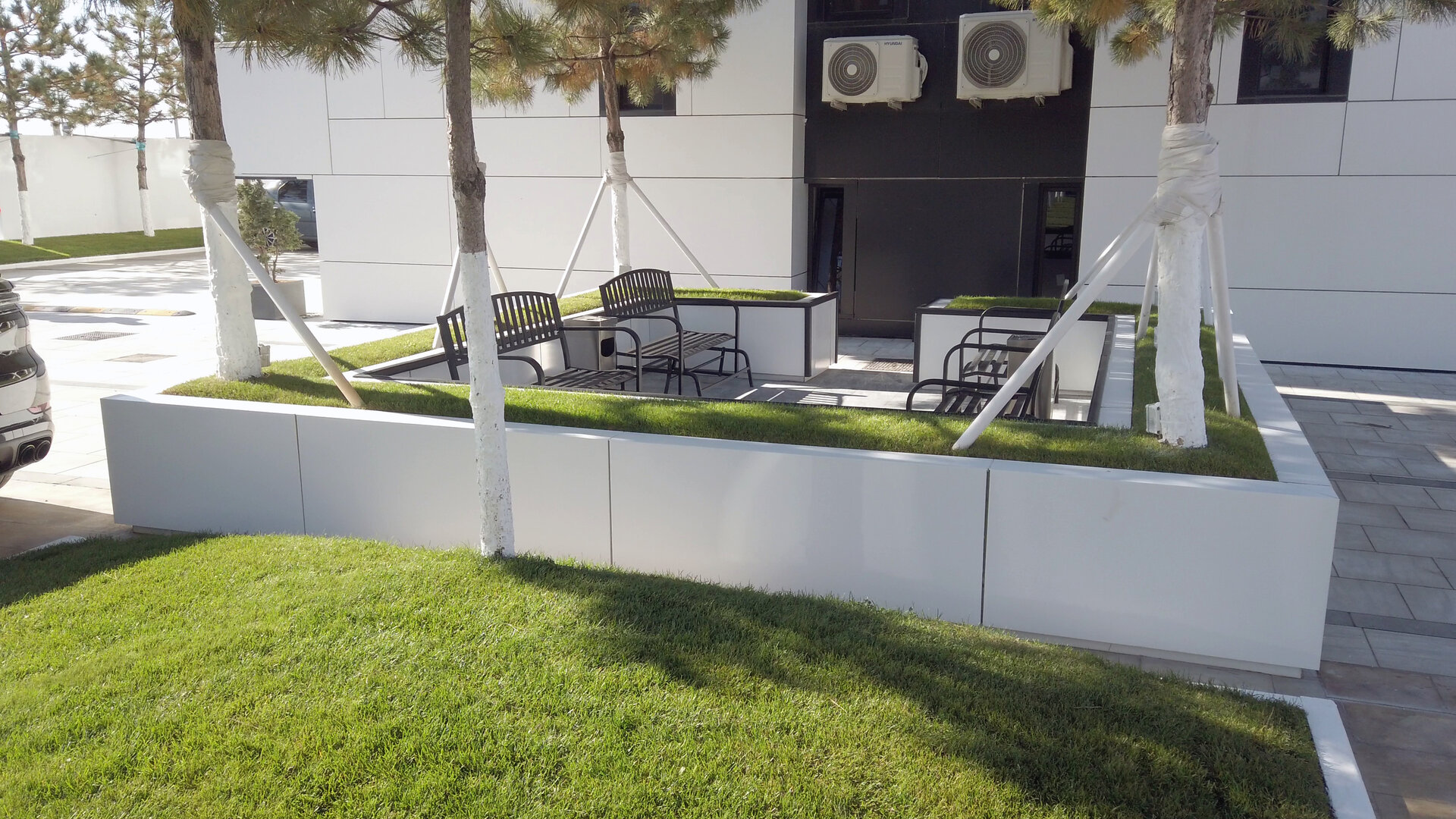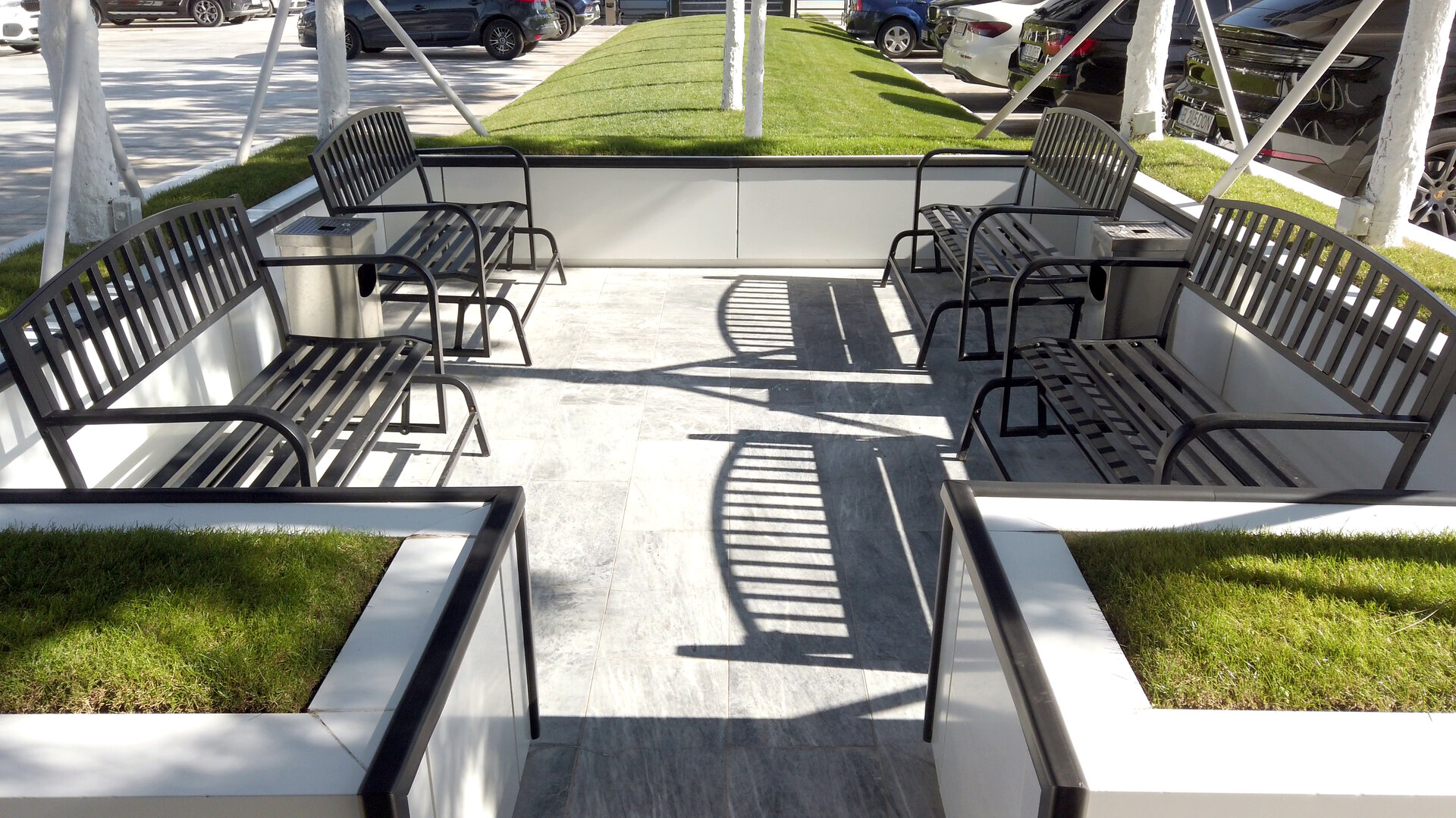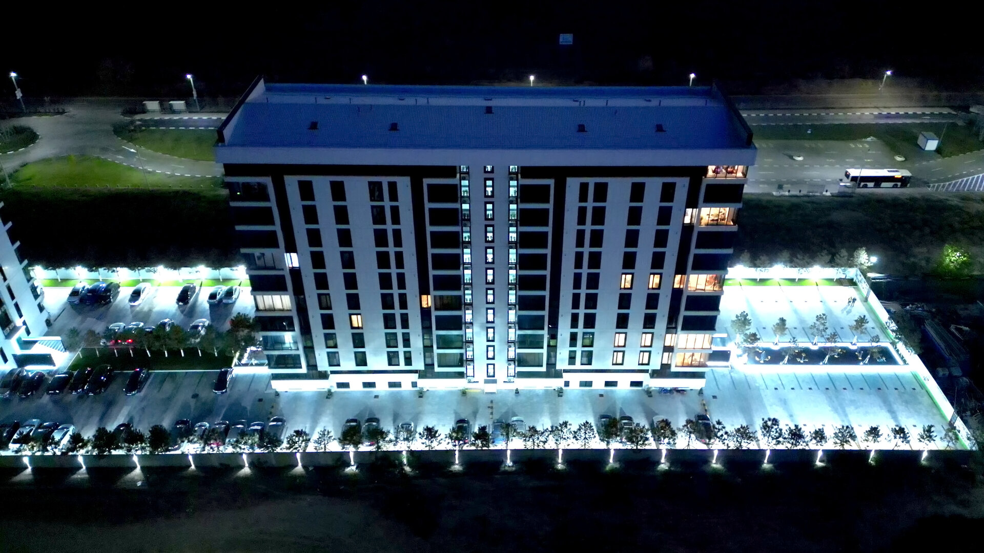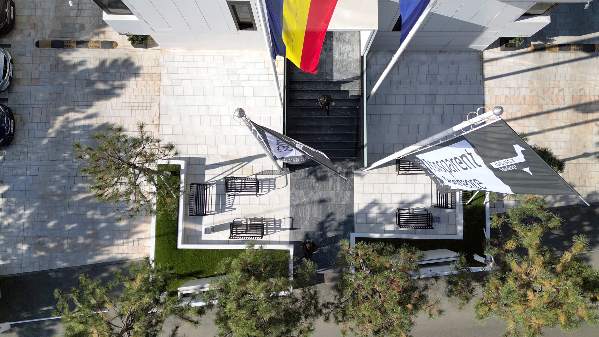 Pavajul întregii curți este realizat din marmură naturală, oferind o imagine unitară, elegantă și premium. Întreg perimetrul ansamblului este bordat de brazi plantați ritmic, care adaugă structură vizuală și umbrire naturală. Iluminatul perimetral LED integrat în garduri și jardiniere conferă un efect nocturn spectaculos, transformând spațiul public într-o experiență vizuală coerentă pe timp de noapte.