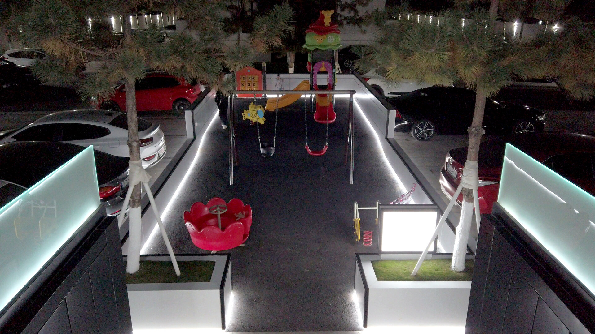 • Între blocul 2 și 3: loc de joacă pentru copii, delimitat de parapeti joasi din alucobond cu iluminare LED la bază, arbori integrați pentru umbrire naturală și siguranță.