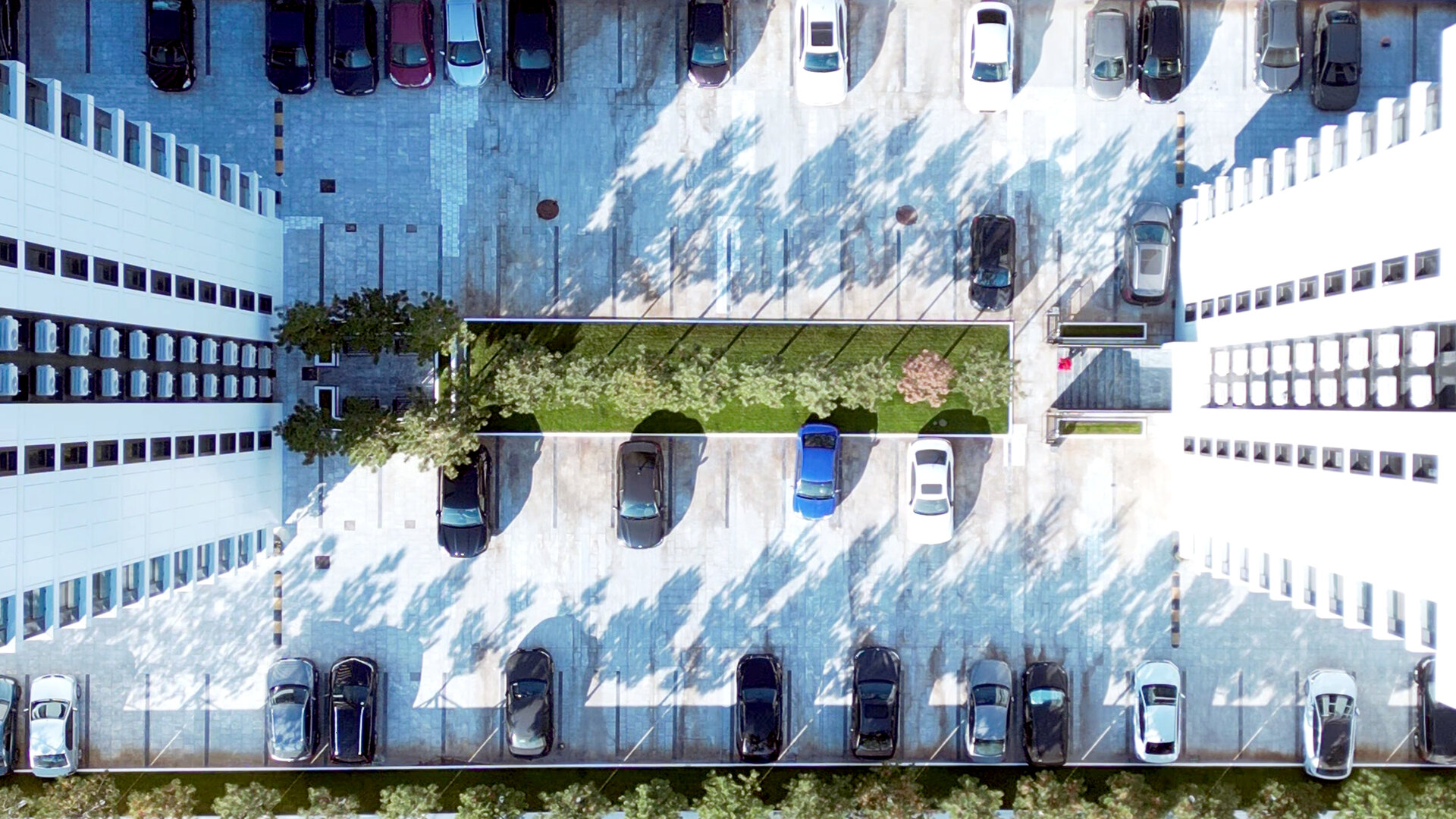 • Între blocul 1 și 2: zonă verde de tranziție, si o intrare cu copertină din alucobond și iluminare ambientală, integrată armonios în limbajul fațadelor ventilate.