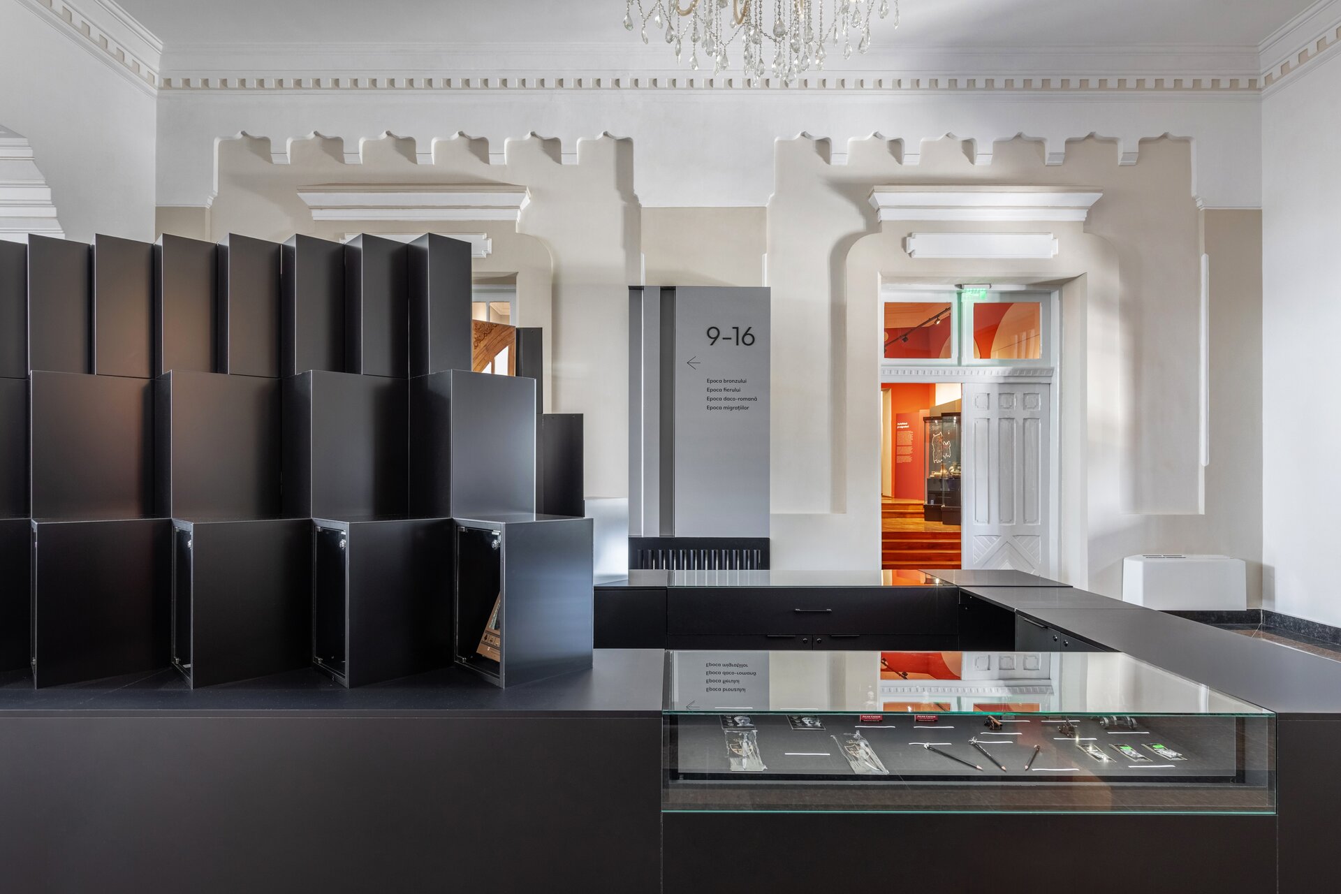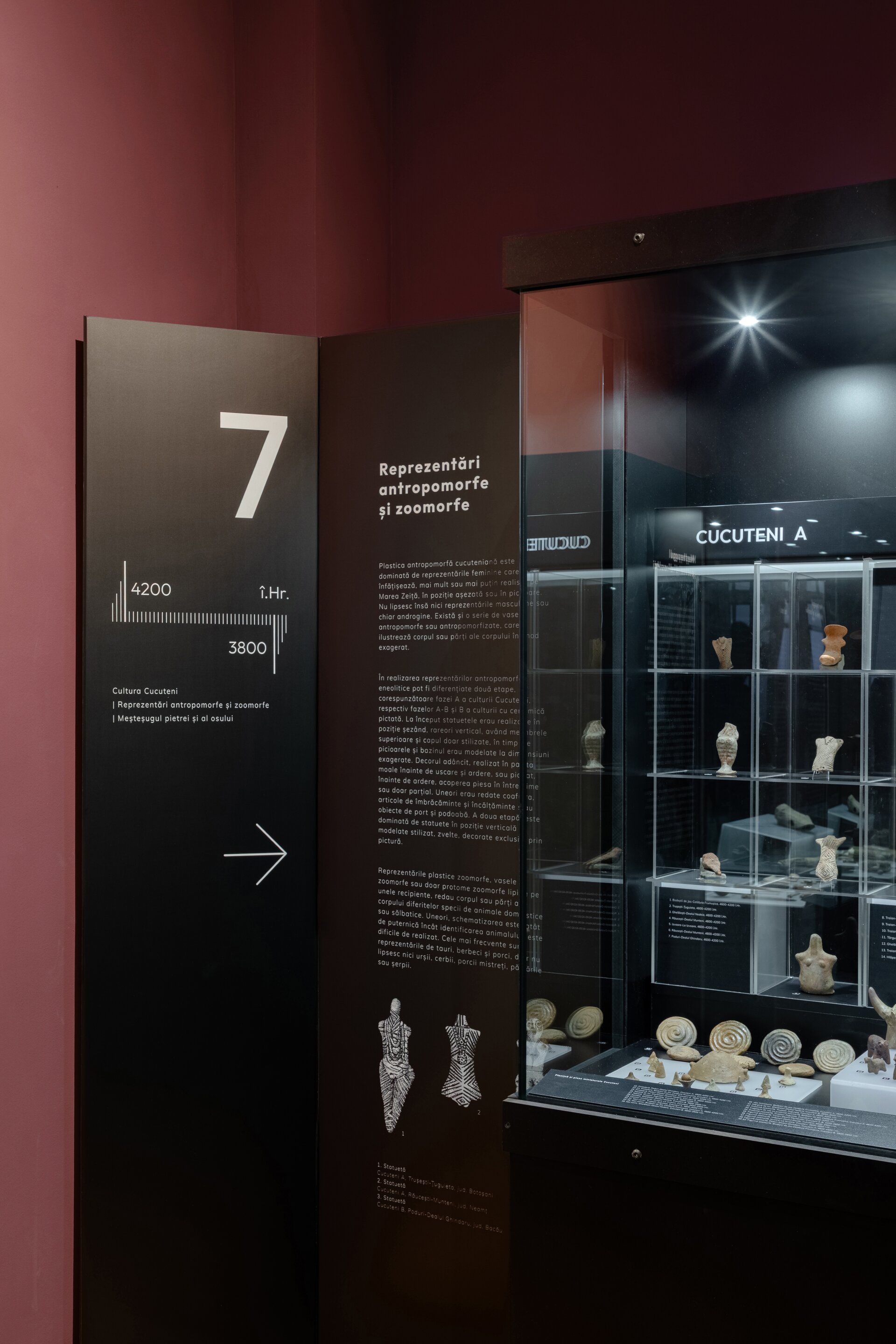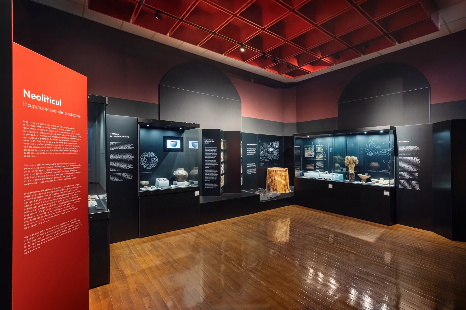 Inspirația pentru paleta cromatică a amenajării expoziționale vine din culorile ceramicii și decorațiunilor specifice vaselor Cucuteni ce constituie un nucleu valoros al colecției muzeului. Panourile explicative au fost integrate într-un parcurs coerent, luând forma unor zigurate, ce integrează vitrine de expunere, ilustrații istorice sau elemente multimedia precum ecrane digitale, holograme sau reconstituiri tip dioramă. Ca intervenție în clădire istorică, provocarea acestui proiect a constat în realizarea unor panouri și a unui mobilier de sine stătător, fără posibilitatea de intervenție asupra pereților clădirii. Astfel, doar sălile de colț sunt marcate prin plafoane casetate realizate din bond vopsit și pun cel mai bine în evidență arhitectura spațiului interior al clădirii istorice.
