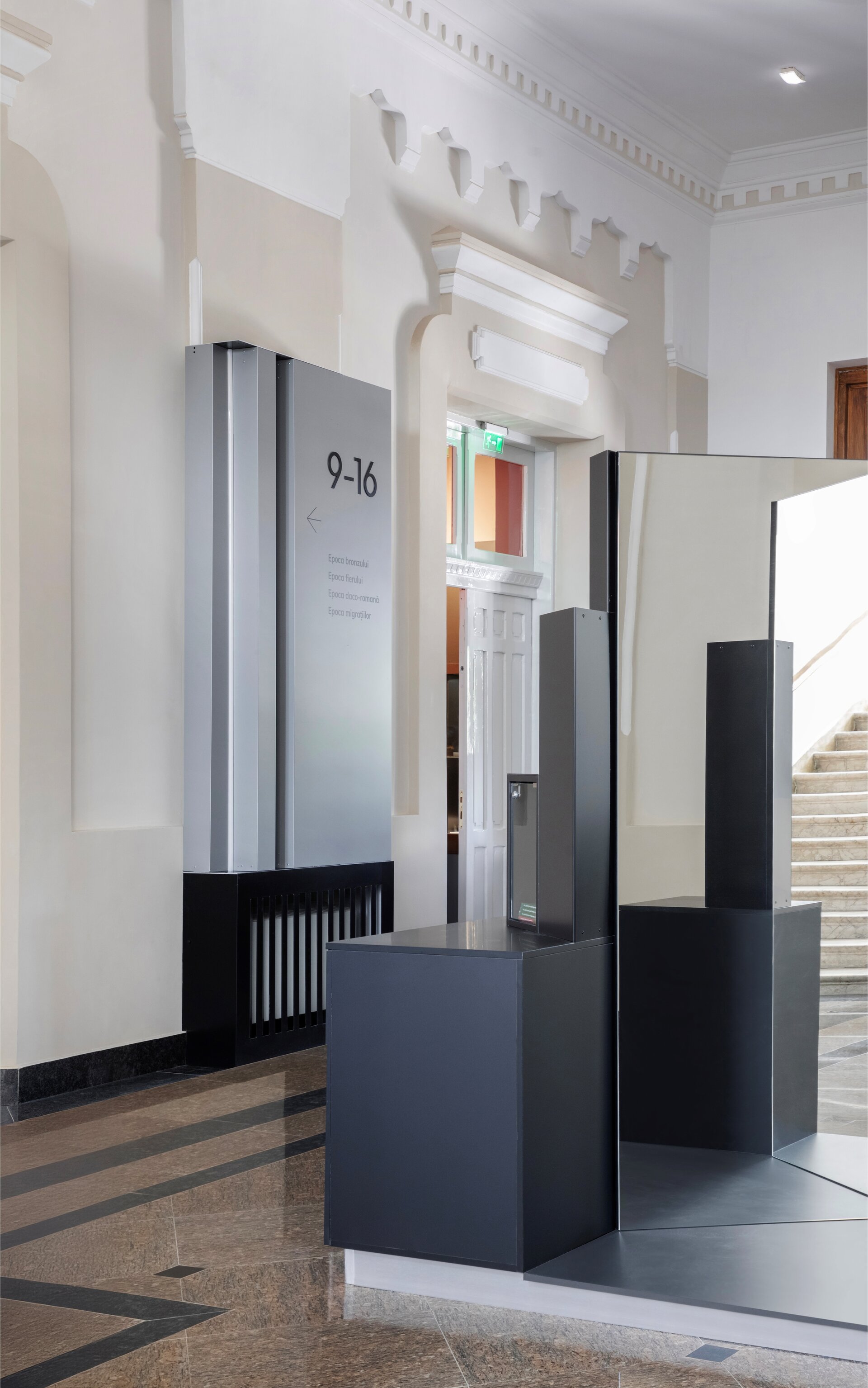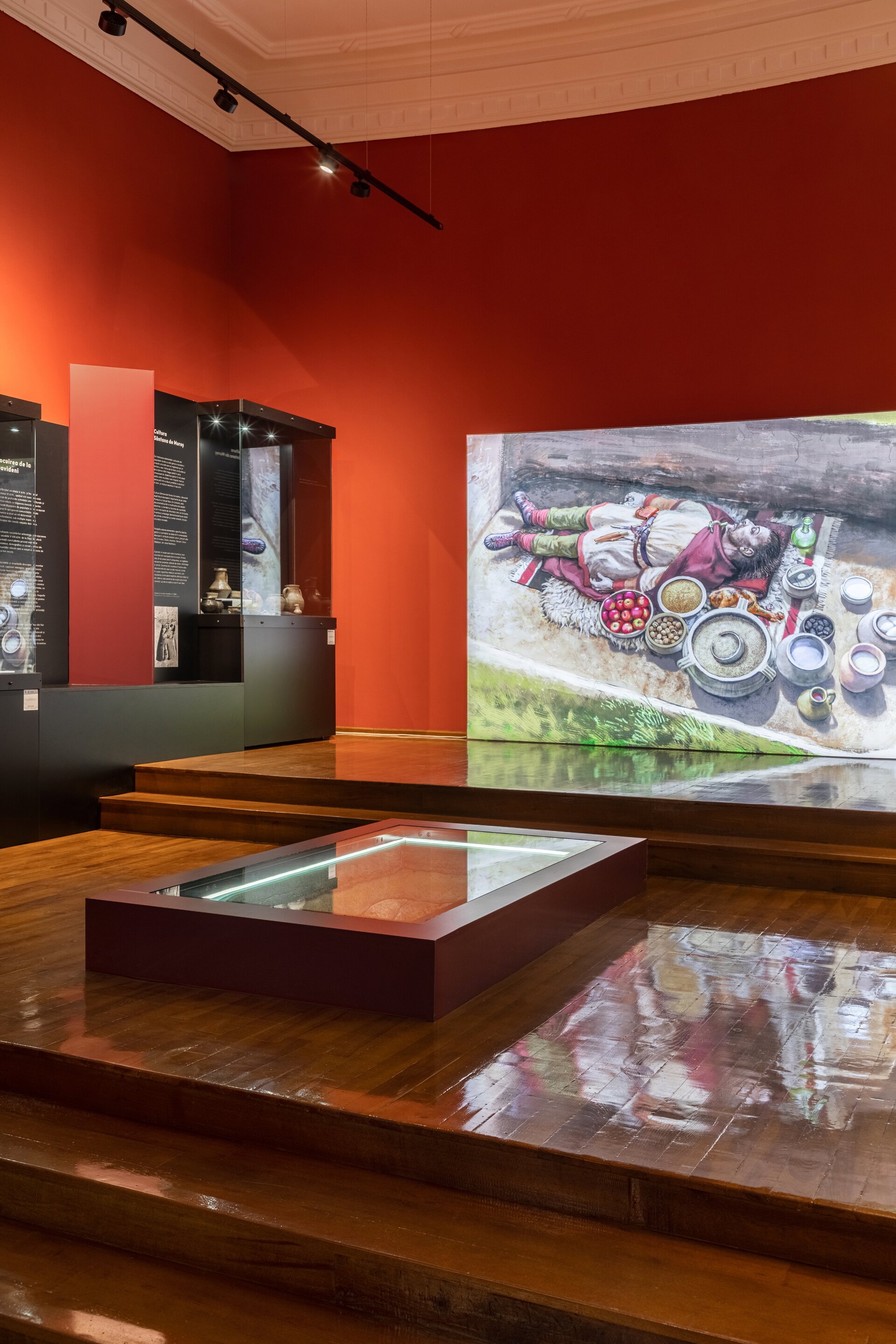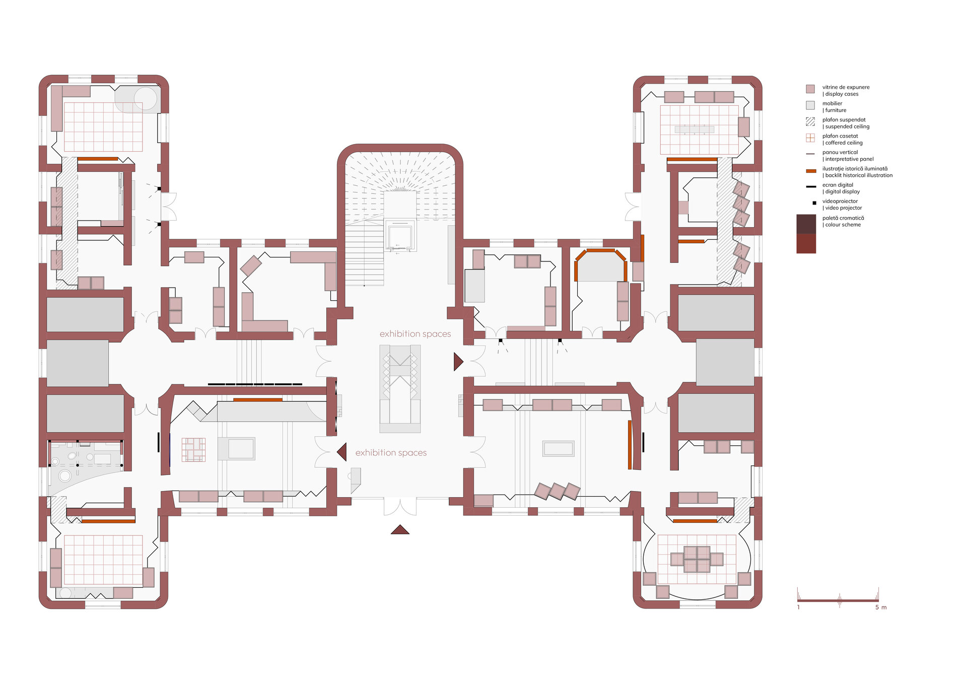 Inspirația pentru paleta cromatică a amenajării expoziționale vine din culorile ceramicii și decorațiunilor specifice vaselor Cucuteni ce constituie un nucleu valoros al colecției muzeului. Panourile explicative au fost integrate într-un parcurs coerent, luând forma unor zigurate, ce integrează vitrine de expunere, ilustrații istorice sau elemente multimedia precum ecrane digitale, holograme sau reconstituiri tip dioramă. Ca intervenție în clădire istorică, provocarea acestui proiect a constat în realizarea unor panouri și a unui mobilier de sine stătător, fără posibilitatea de intervenție asupra pereților clădirii. Astfel, doar sălile de colț sunt marcate prin plafoane casetate realizate din bond vopsit și pun cel mai bine în evidență arhitectura spațiului interior al clădirii istorice.